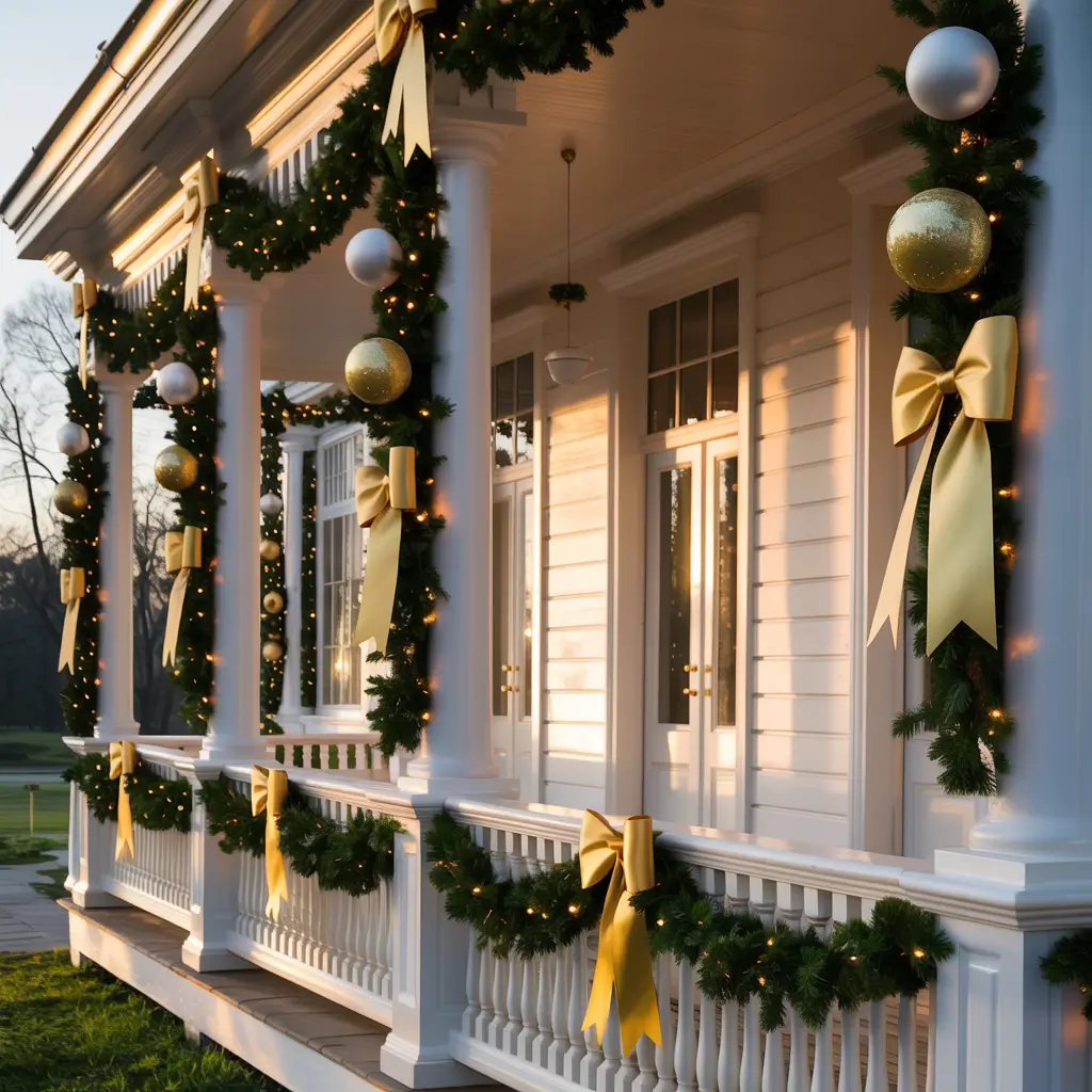 Sometimes you want your porch to whisper elegance rather than shout Christmas. Gold and white creates sophistication that impresses without overwhelming.