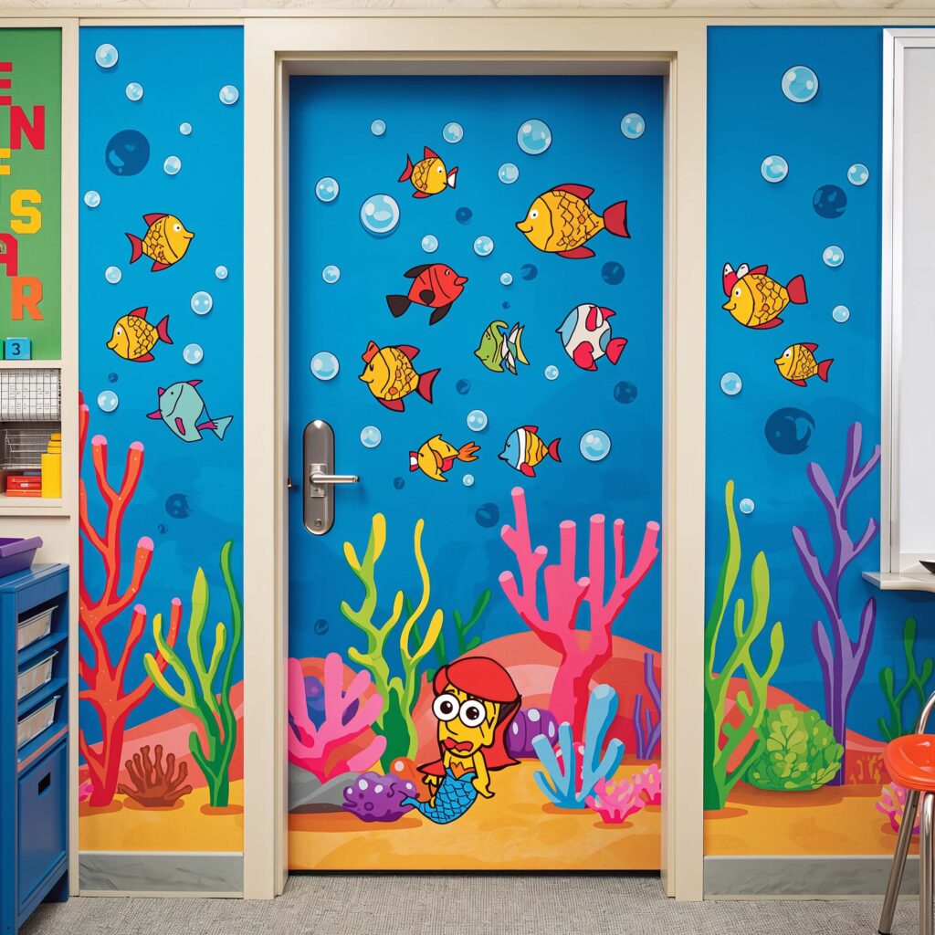 Who says you need to visit an aquarium when you can transform your door into an underwater wonderland? This theme works incredibly well because it combines education with pure visual delight. Parents love seeing their kids’ faces peeking out from submarine portholes or swimming alongside paper seahorses.
