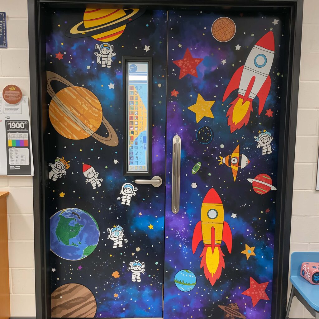 Space themes never go out of style, and honestly, why would they? There’s something about a galaxy door that makes both kids and adults stop to wonder. I’ve found that parents especially appreciate STEM-themed decorations because it shows you’re encouraging scientific thinking.