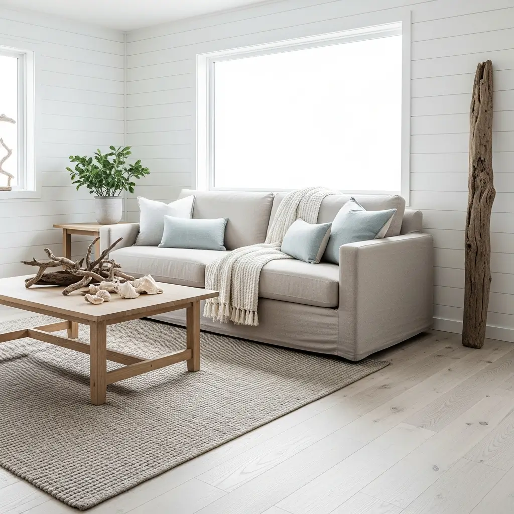 My beach inspiration comes from memories of New England beach houses – white painted wood, sun-bleached textiles, weathered furniture that’s lived through salty air. I recreated this feeling using a white slipcovered sofa, driftwood-gray coffee table, and sandy beige accents throughout.