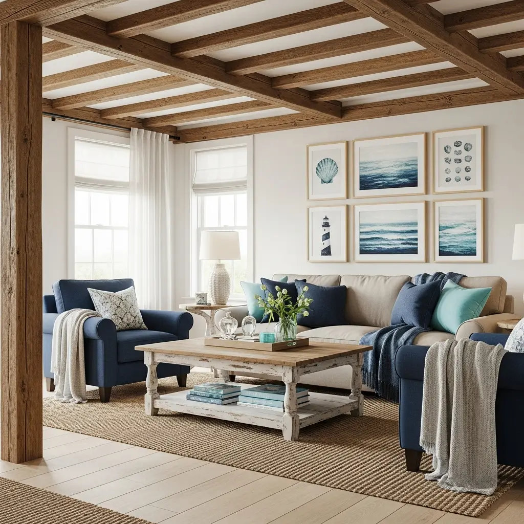 I incorporated ocean blues through textiles and accessories rather than painting walls. Blue and white striped pillows, a vintage blue jar collection, and a faded blue throw. The rustic wood furniture grounds these lighter elements, creating balance that feels both beachy and grounded.
