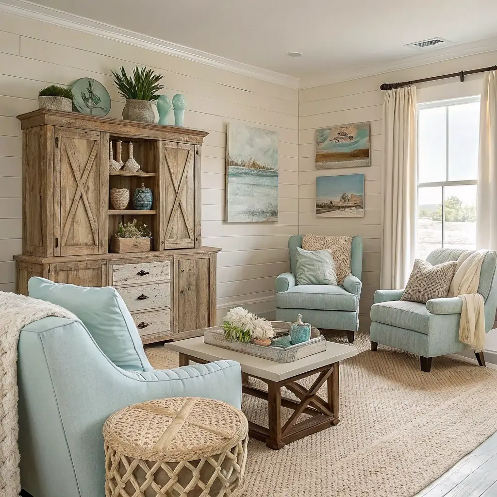The key is choosing the right blue tones. Forget bright navy or tropical turquoise – coastal farmhouse blues are softer, more muted. Think faded denim, dusty aqua, or that perfect “I’ve been sitting in the sun for years” shade of weathered blue.