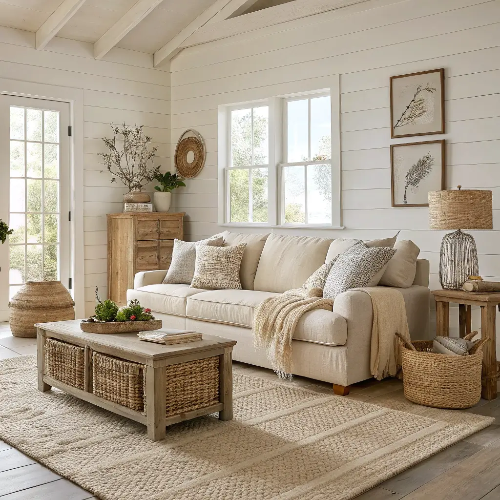 Coastal farmhouse thrives on warm neutrals that prevent the space from feeling cold or sterile. While pure white works beautifully, layering in creams, beiges, warm grays, and natural wood tones creates depth and coziness.