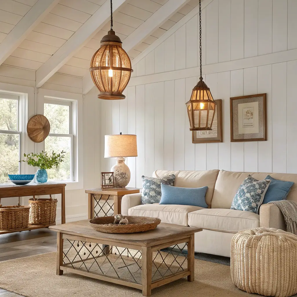 Lighting in coastal farmhouse spaces needs to enhance the natural light during the day and create warm ambiance at night. I use approximately eight different light sources in my living room, and yes, that seems excessive until you see how it transforms the space.