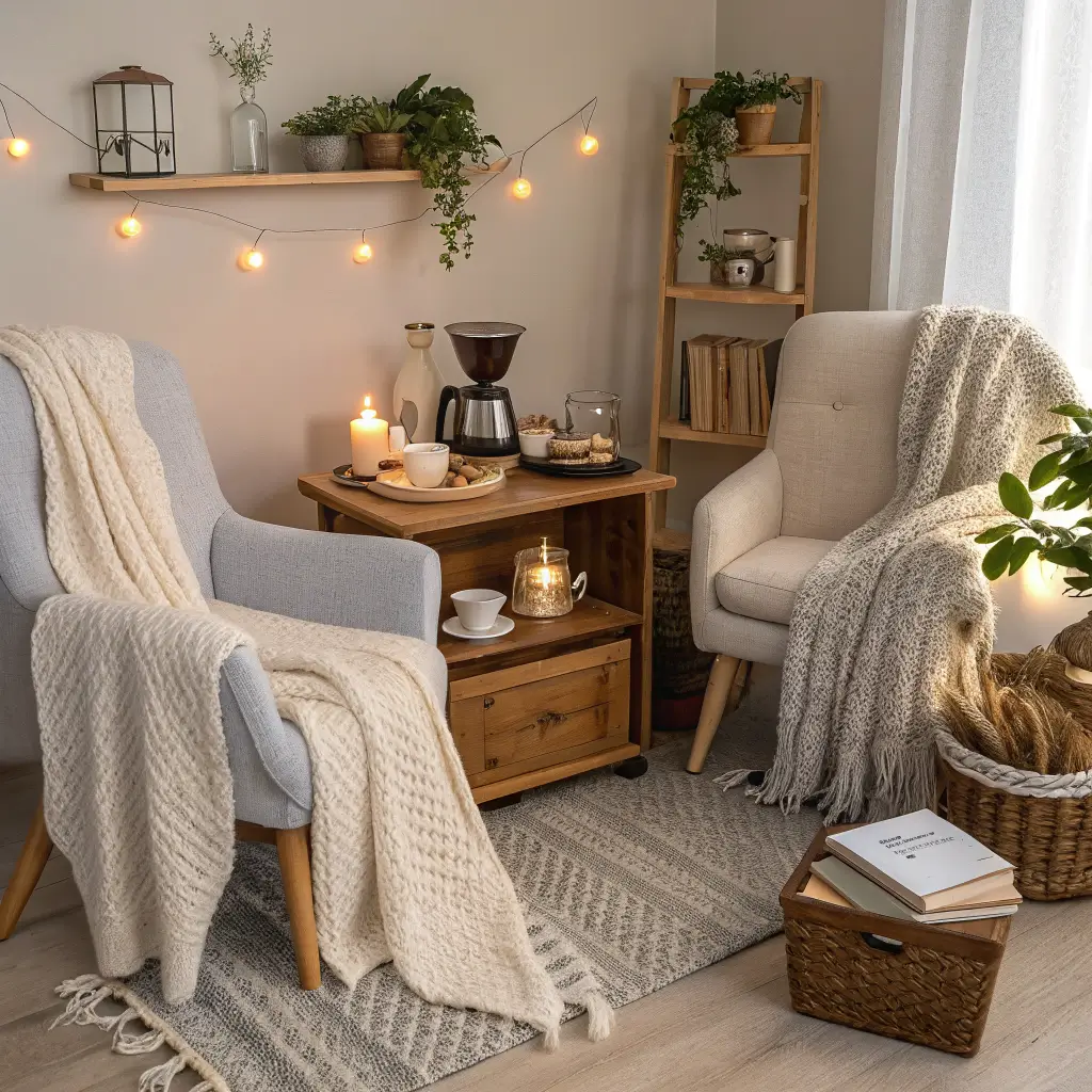 Start with warm lighting—string lights, candles, or warm-toned bulbs. Add soft textures through runners, trivets, or mug cozies. Include natural elements like wood, wool, and plants. Create nooks within your coffee bar for extra coziness.