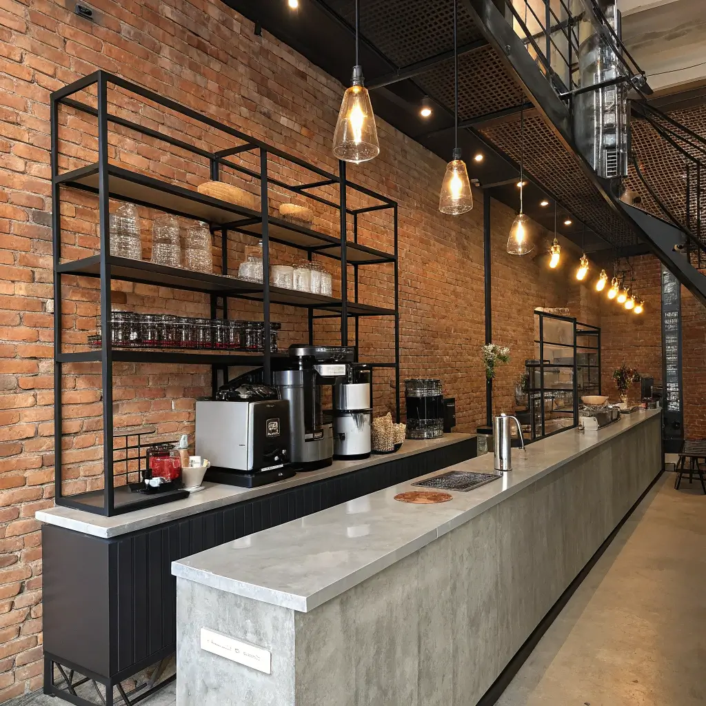 Embrace metal, concrete, and raw wood. Install pipe shelving or metal racks. Choose a serious-looking coffee machine in black or steel. Display coffee beans in laboratory-style glass containers.