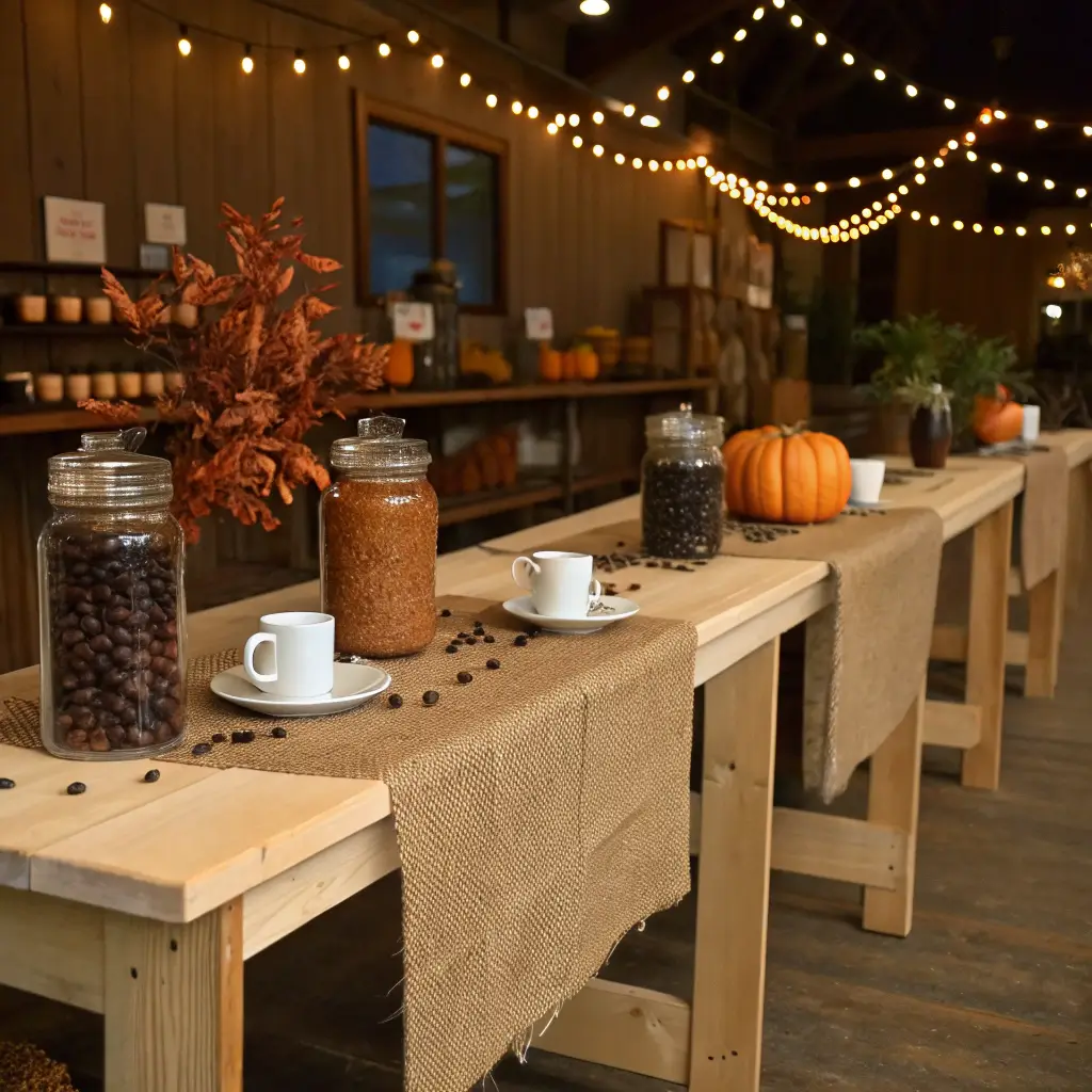Stack wooden crates at different heights to create levels for your coffee supplies. Drape some burlap or checkered fabric as a table runner, and you’re already halfway there. Add some fairy lights wrapped around the setup, and watch your guests’ faces light up.