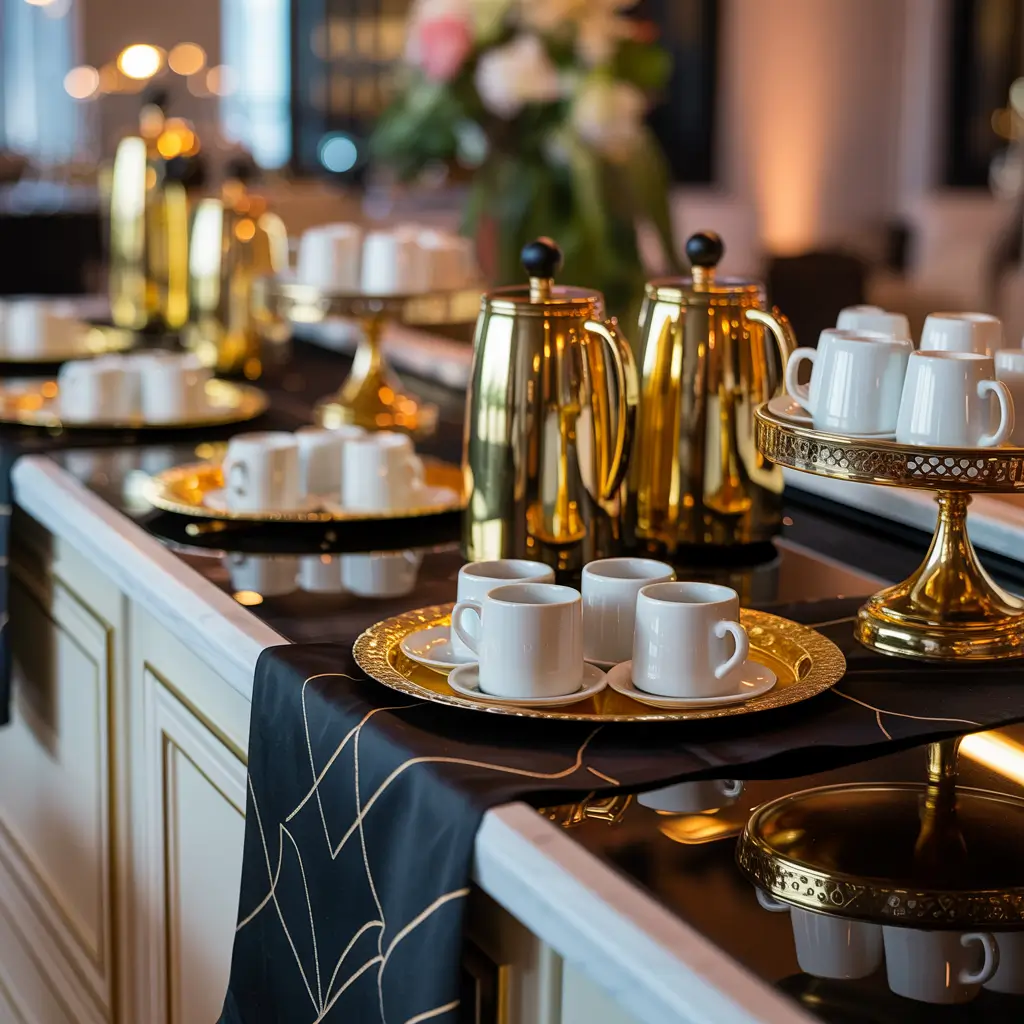Metallic accents elevate even basic coffee supplies. Gold spoons, black napkins, and maybe some edible gold leaf for garnishing – suddenly your home feels like a five-star hotel. I went all out for my 30th with this theme, and people still talk about how fancy they felt.