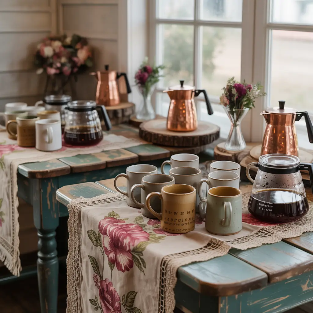 Farmhouse style brings that Joanna Gaines magic to your party without requiring a full renovation. Vintage farmhouse coffee bars combine nostalgia with functionality for a setup that feels both special and approachable.