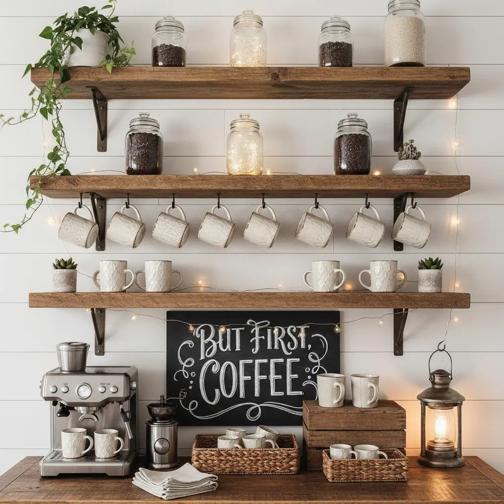 They free up counter space, look amazing, and turn your coffee supplies into functional decor. Ready to transform that boring wall into a coffee lover’s paradise?