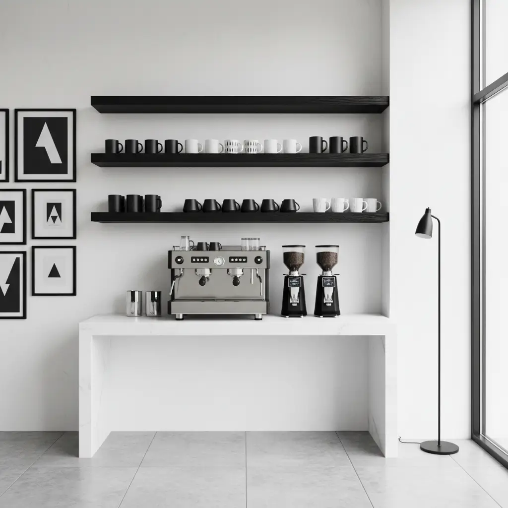 3. Modern Black & White Coffee Shelf Setup