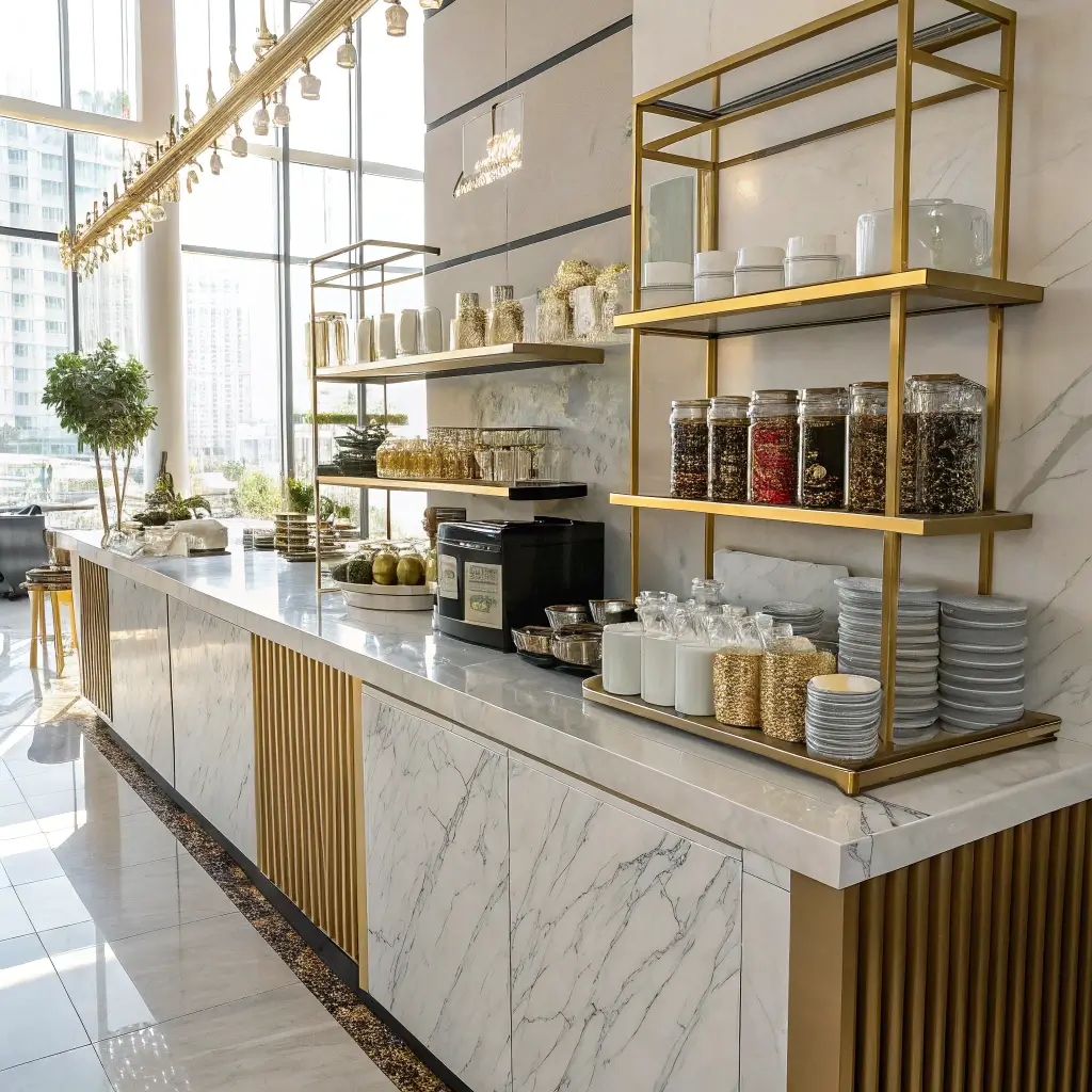 - Marble backdrop behind shelves