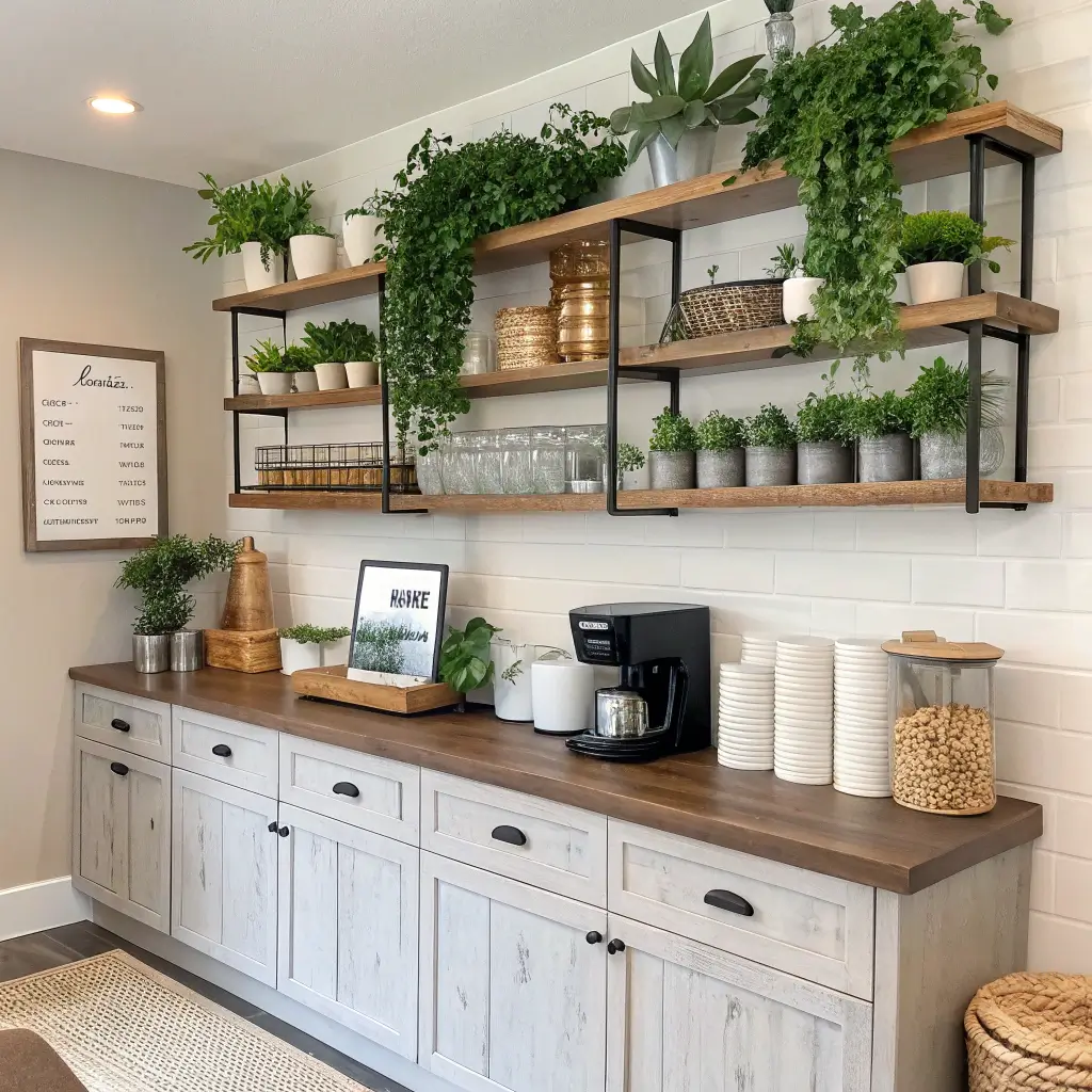11. Open Shelving Coffee Bar with Greenery