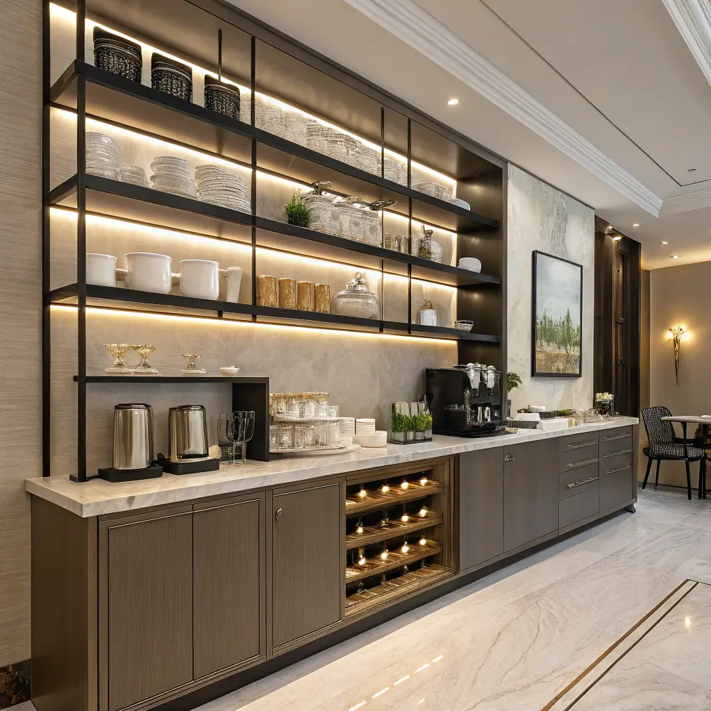 Sometimes you want your coffee bar to look like it belongs in a luxury hotel. The elegant floating shelf display makes every cup feel like a special occasion.