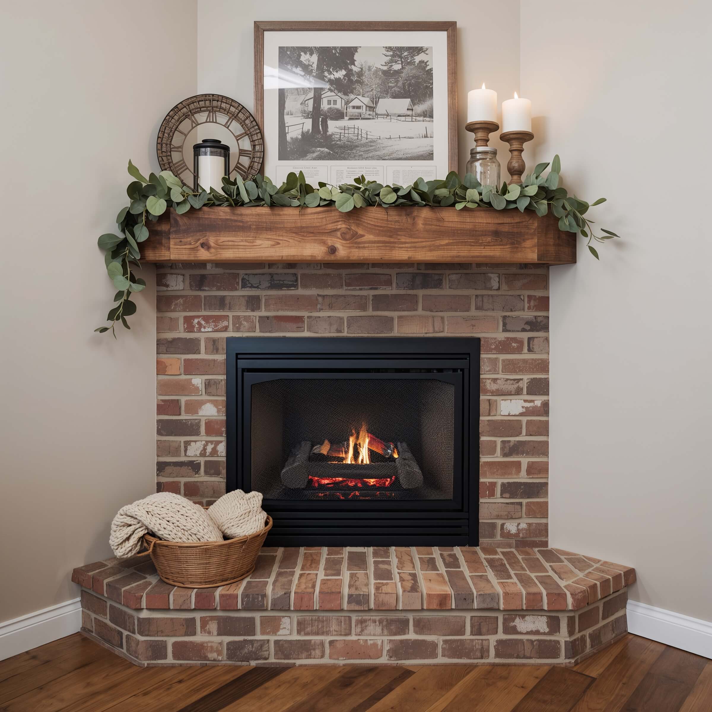 A wood mantel changes everything. I’ve seen plain corner fireplaces go from forgettable to stunning just by adding one solid beam mantel. Simple, but weirdly powerful.