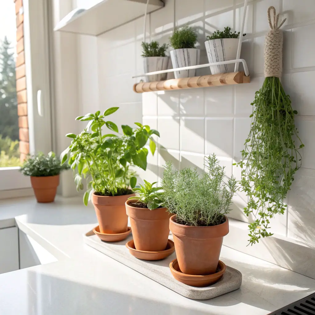 My corner herb setup features basil, rosemary, and mint in simple white pots on a small wooden tray. I positioned them where morning light hits from two windows, and they’re thriving. The corner placement means they’re out of my cooking way but within arm’s reach when I need fresh flavor. That’s the sweet spot right there.