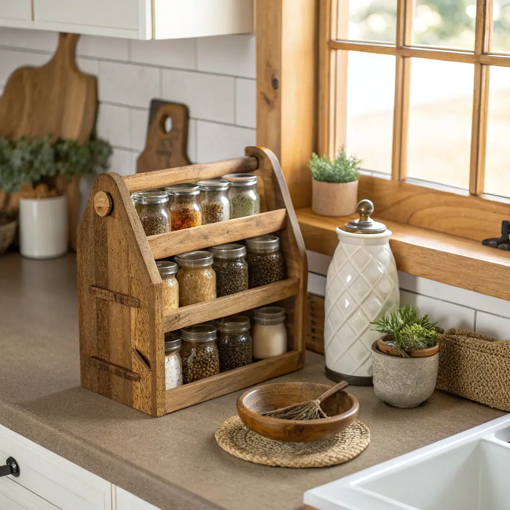 FYI, I switched from cabinet spice chaos to a corner wooden rack last year, and it changed my cooking game entirely. Everything’s visible, accessible, and somehow having them displayed makes me actually use that sumac I impulse-bought. The rustic wood adds warmth to my otherwise modern kitchen.