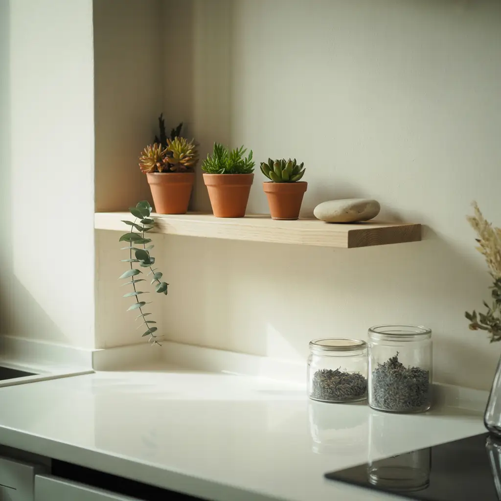 The angular nature of corners naturally creates a tiered display opportunity. You can arrange herbs at different heights without them looking randomly scattered across your counter.