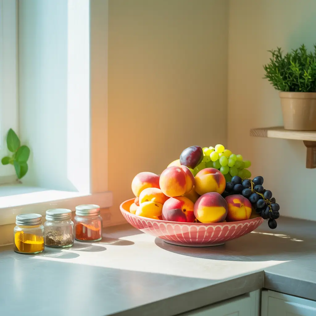 A vibrant fruit bowl paired with coordinating storage jars creates functional rainbow storage that brightens corner spaces naturally.
