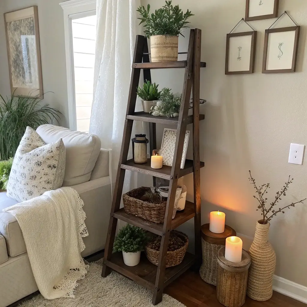 The key to ladder shelves? Embrace the casual chaos. These aren’t meant to look perfect or symmetrical. I mix books, plants, and random treasures on mine, and it looks like it belongs in a Pinterest board titled “Cozy Homes That Make You Want to Quit Your Job and Become a Potter.”