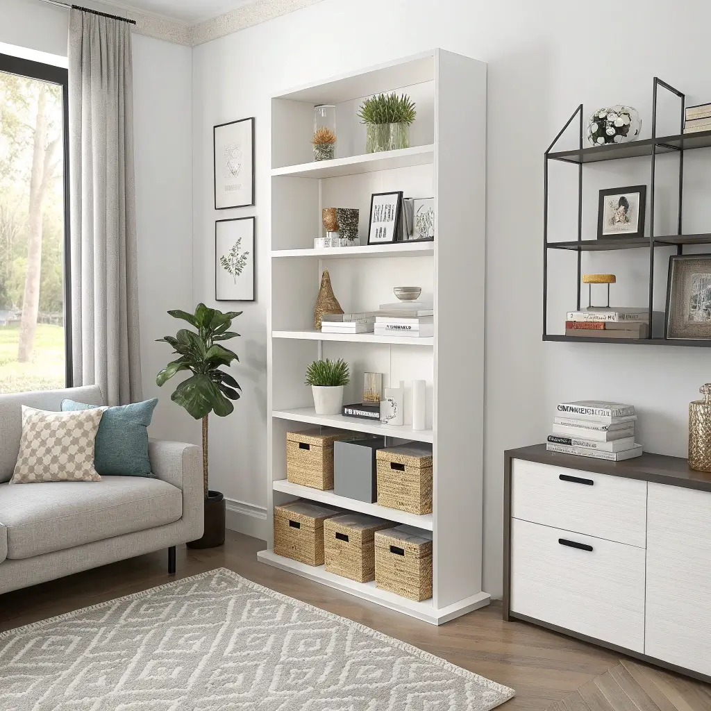My tower has eight shelves of varying heights, and each one serves a purpose. Books on the middle shelves (easy reaching height), decorative items up top where dust is less noticeable, and storage baskets at the bottom for hiding life’s less photogenic necessities.