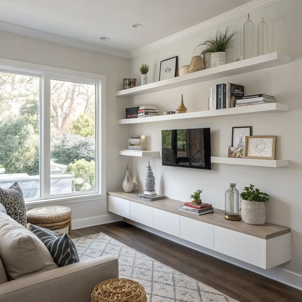 I keep my floating shelves styled with the “rule of three” – odd numbers look more natural and less staged. Usually, I go with a small plant, a candle, and one decorative object. Rotate these items seasonally, and boom – your corner stays fresh without any major redecorating.