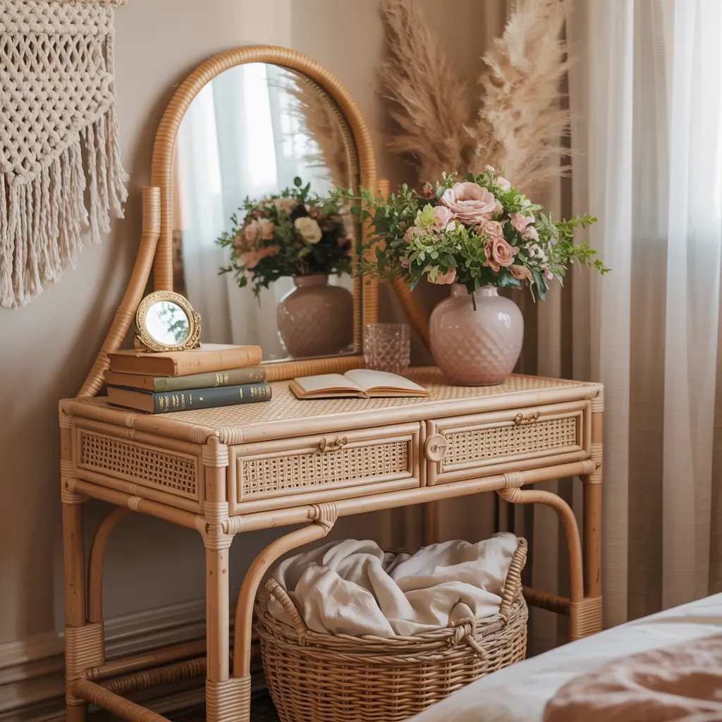 If minimalism makes you yawn, let’s talk about bringing some texture into your space. Rattan corner vanities scream laid-back luxury while keeping things functional. They’re basically the bedroom equivalent of that friend who looks effortlessly put-together even in sweatpants.