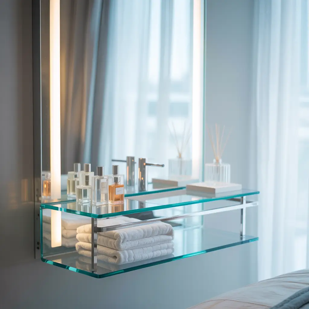 Glass vanities create this floating, ethereal look that’s perfect for small spaces. The transparency keeps sight lines open, making your bedroom feel larger and less cluttered. Plus, they’re surprisingly practical – you can see everything at a glance.