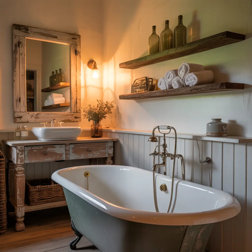 Pair a vintage clawfoot tub with ultra-modern fixtures. Install a farmhouse sink with sleek, minimalist faucets. Combine shiplap walls with geometric floor tiles. The contrast creates visual interest and prevents your bathroom from looking like a time capsule.
