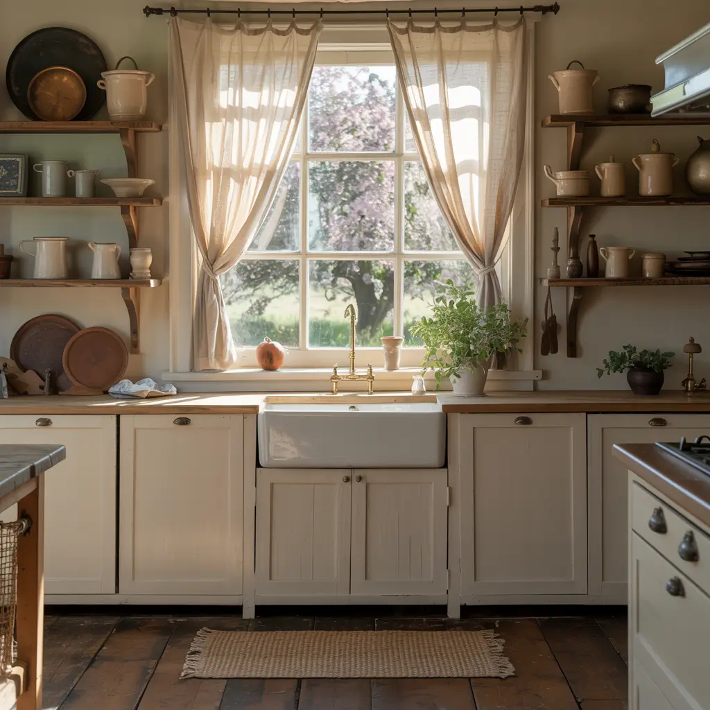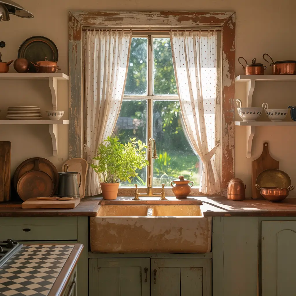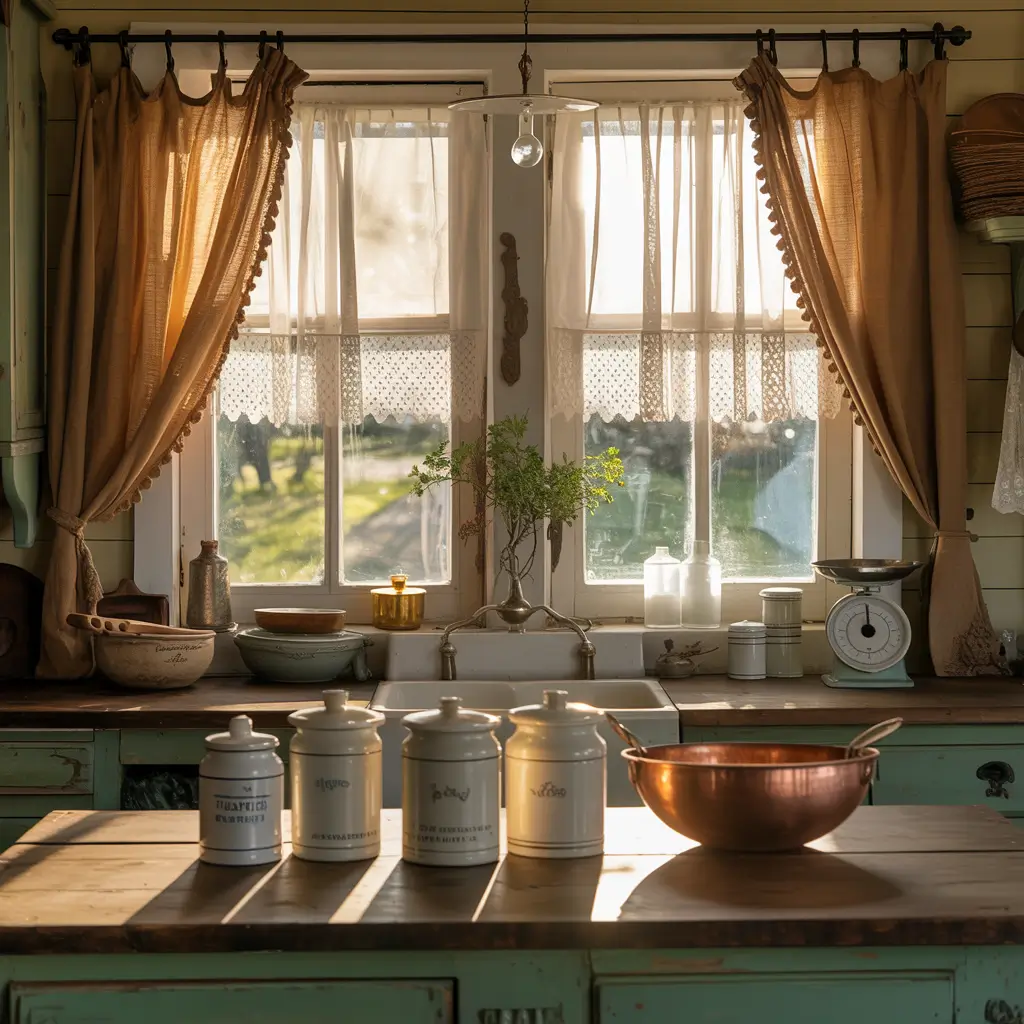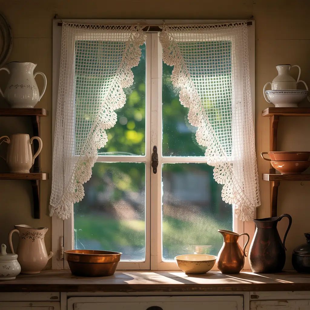 Real or faux crochet lace curtains bring vintage charm that feels collected rather than purchased. Half curtains provide privacy while maintaining that light, airy feeling country kitchens need.