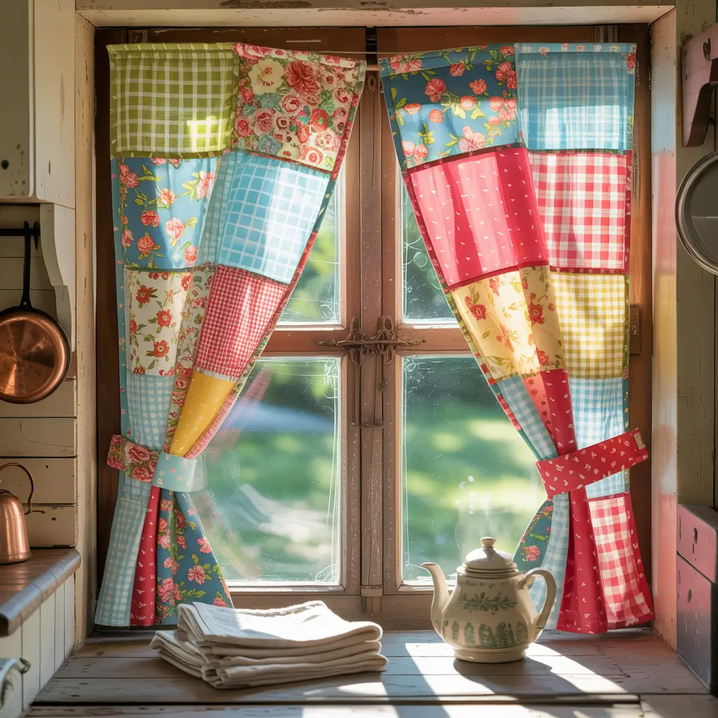 I turned a damaged quilt into café curtains (the bottom was stained beyond saving). Now I have one-of-a-kind window treatments that make everyone ask where I bought them. The mix of patterns and colors adds personality without requiring any other decoration.