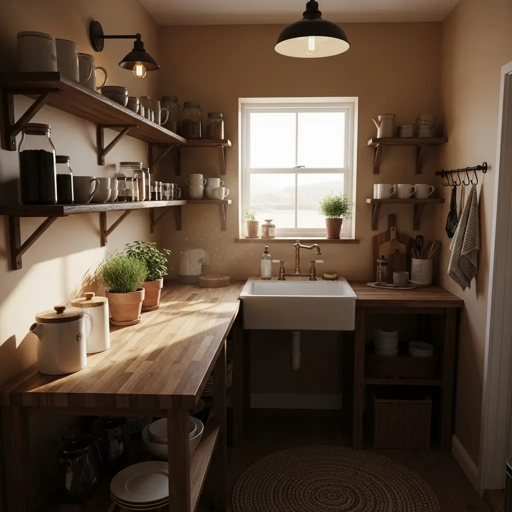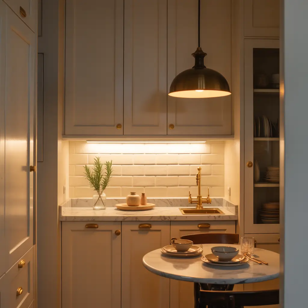 The key is avoiding single overhead sources. I use battery-operated lights under cabinets, LED strips behind open shelving, and a small lamp on the counter. This distributed lighting eliminates harsh shadows and makes the space feel larger and more welcoming.