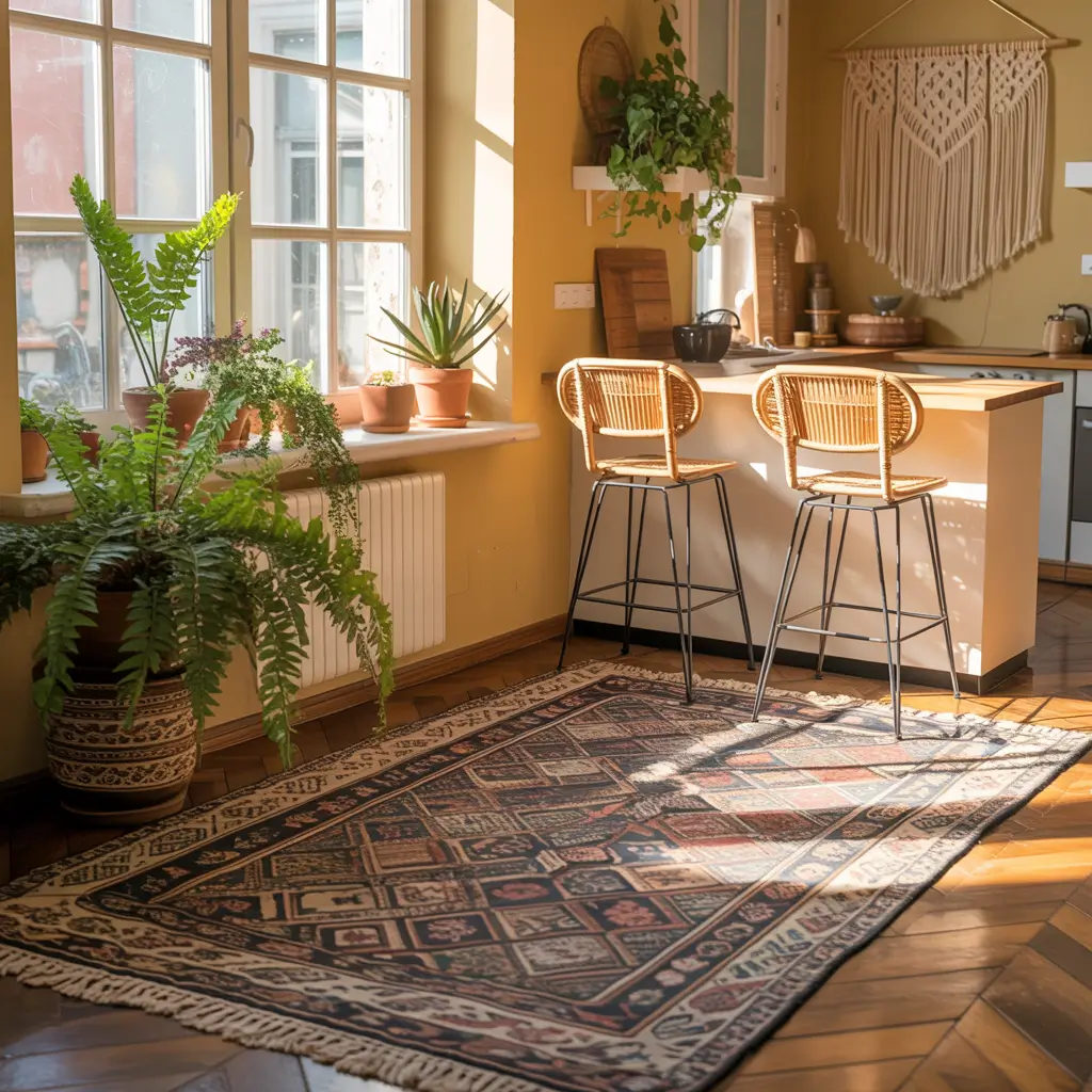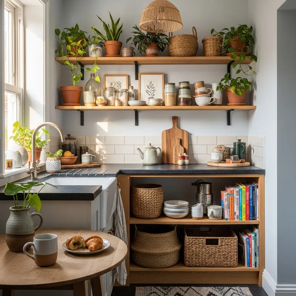 Layer patterns and textures fearlessly. Macramé plant hangers (damage-free hooks!), woven baskets for storage, colorful tea towels, maybe a small kilim rug. The key is keeping a cohesive color palette so the eclecticism feels curated, not chaotic.