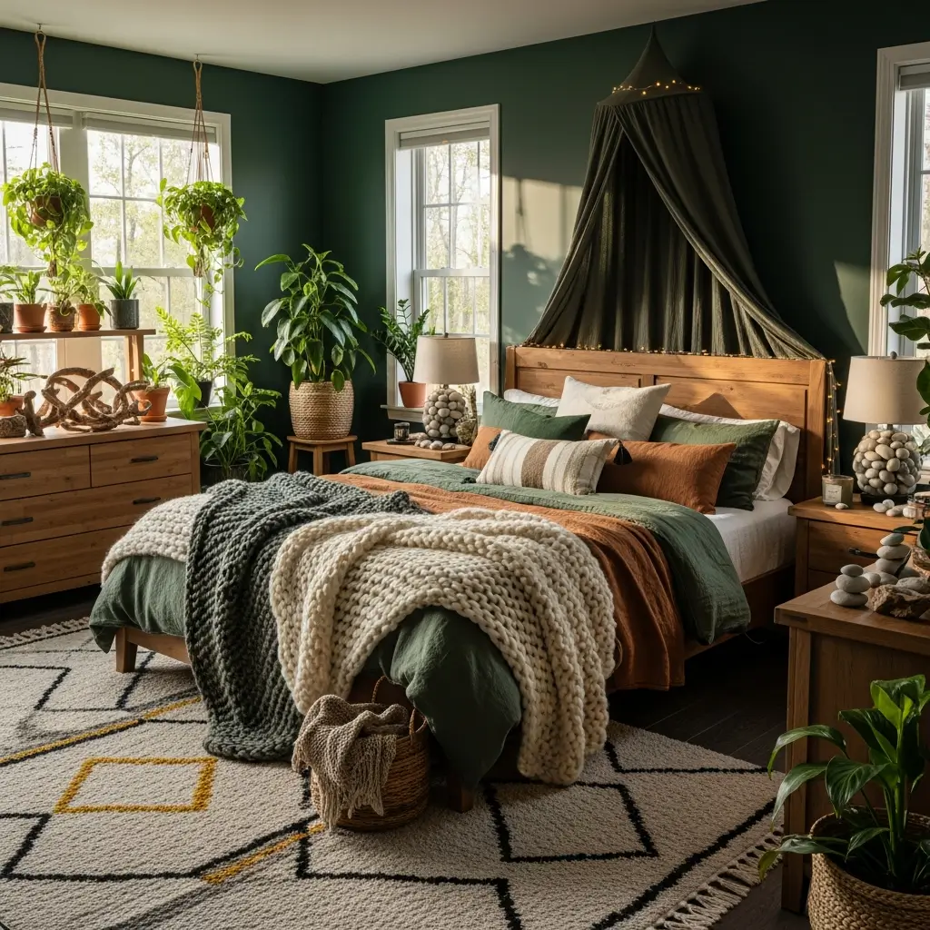 Pile on the textiles like your life depends on it. Start with your bed—a green quilt, patterned pillows in various shapes and sizes, a woven throw, maybe a faux fur accent pillow. Layer rugs on the floor. Hang tapestries or woven wall hangings. The more texture, the cozier it feels.