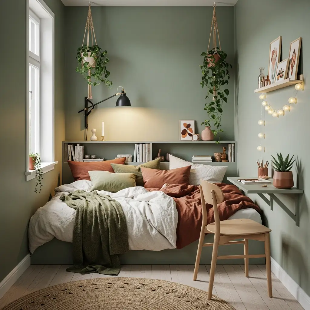 Got a tiny bedroom? Don’t worry—green actually works beautifully in small spaces when you’re smart about it. A small cozy green bedroom can feel intimate rather than cramped.