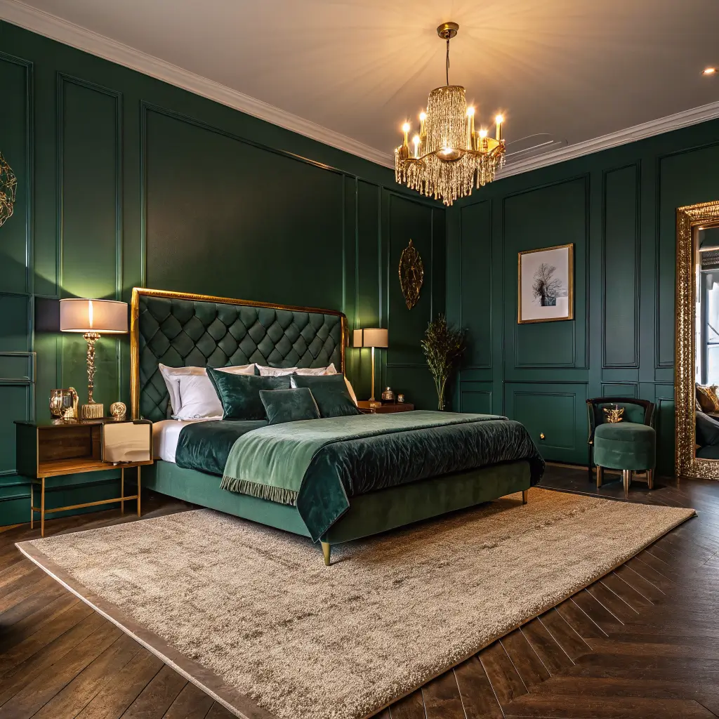 Choose plush materials and textures. Velvet headboards, silk pillows, faux fur throws, and high-pile rugs all scream luxury. The contrast between deep green walls and soft, touchable materials creates that five-star hotel feeling.