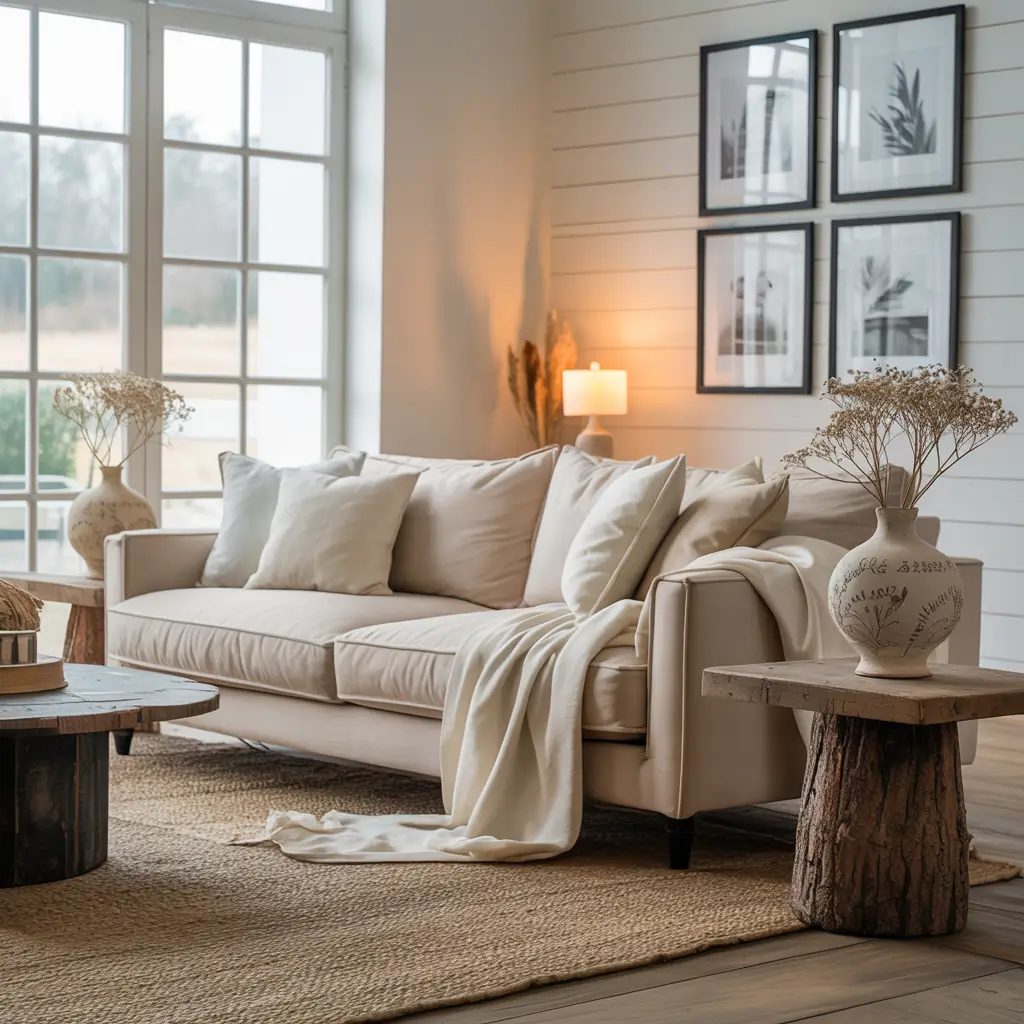 The palette stays earthy but edited: warm whites, soft grays, natural wood tones, and maybe one accent color (sage green or dusty blue work beautifully). Every piece needs to earn its place – no random decorative objects just because they’re “farmhousey.”