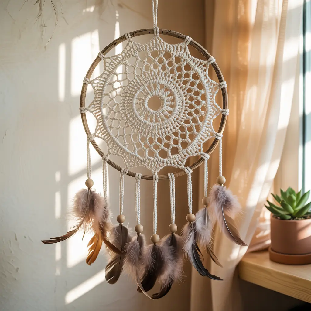Start with a simple doily pattern in the center of your hoop – there are tons of free patterns online. Then get creative with the hanging elements. I like adding crochet feathers (yes, that’s a thing) because they last forever and won’t get dusty like real ones. Plus, my cat can’t destroy them, which is always a bonus.