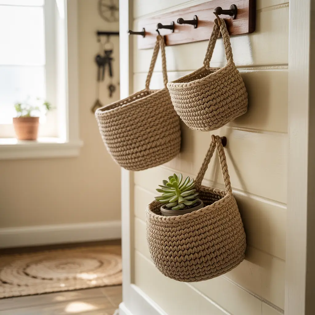 After my thousandth “where are my keys?” morning panic, I crocheted a series of wall baskets by the door. Problem solved, plus my entryway looks like it belongs on a farmhouse blog. Win-win, right?