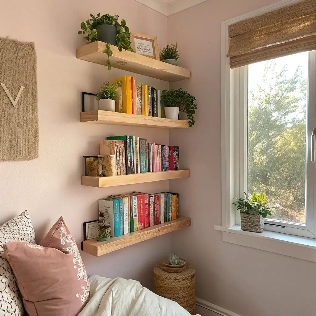 Floating bookshelves create visual intrigue by hiding the actual shelf mechanism, making your books look like they’re floating in mid-air. It’s the kind of cute detail that makes visitors do a double-take and ask “wait, how is that working?”