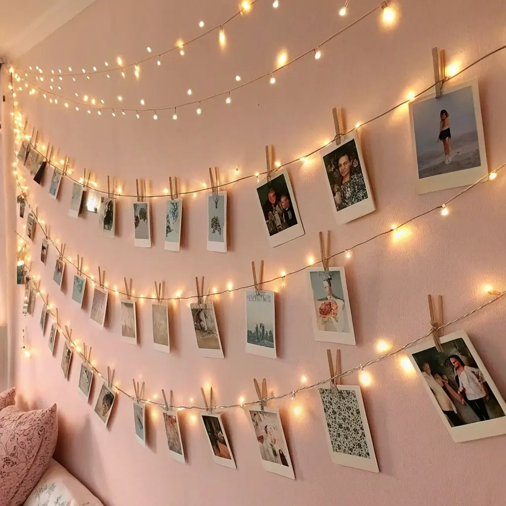 Combining fairy lights with photos creates that dreamy, twinkling effect that’s basically the definition of cute room decor. This project brings warmth, personality, and a soft glow to any wall.