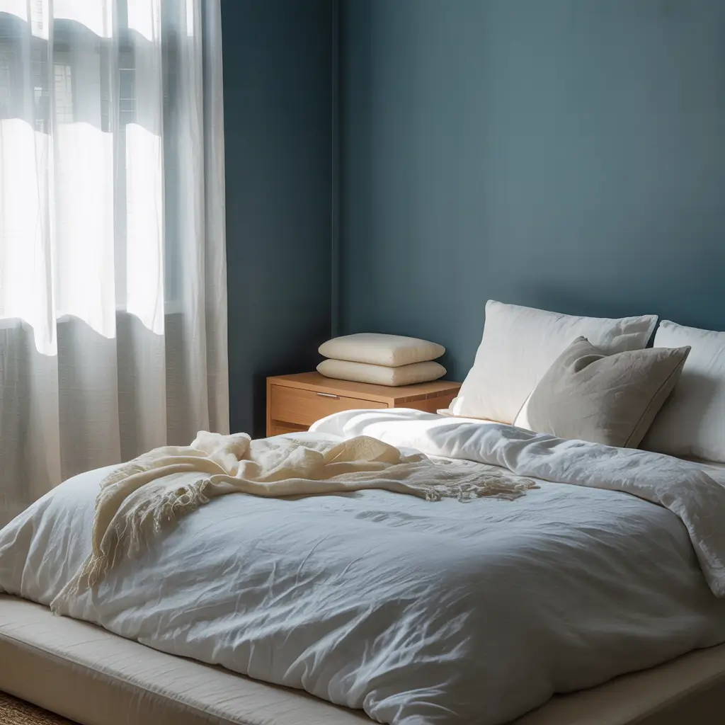 I helped a friend create this look in her city apartment, and the result was stunning. Dark blue walls, white linen bedding, a simple wooden bed frame, two nightstands, and one piece of meaningful art. Nothing else. The room felt like an exhale.