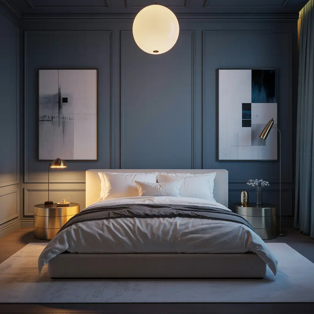Modern Dark Blue Bedroom with Metallic Accents