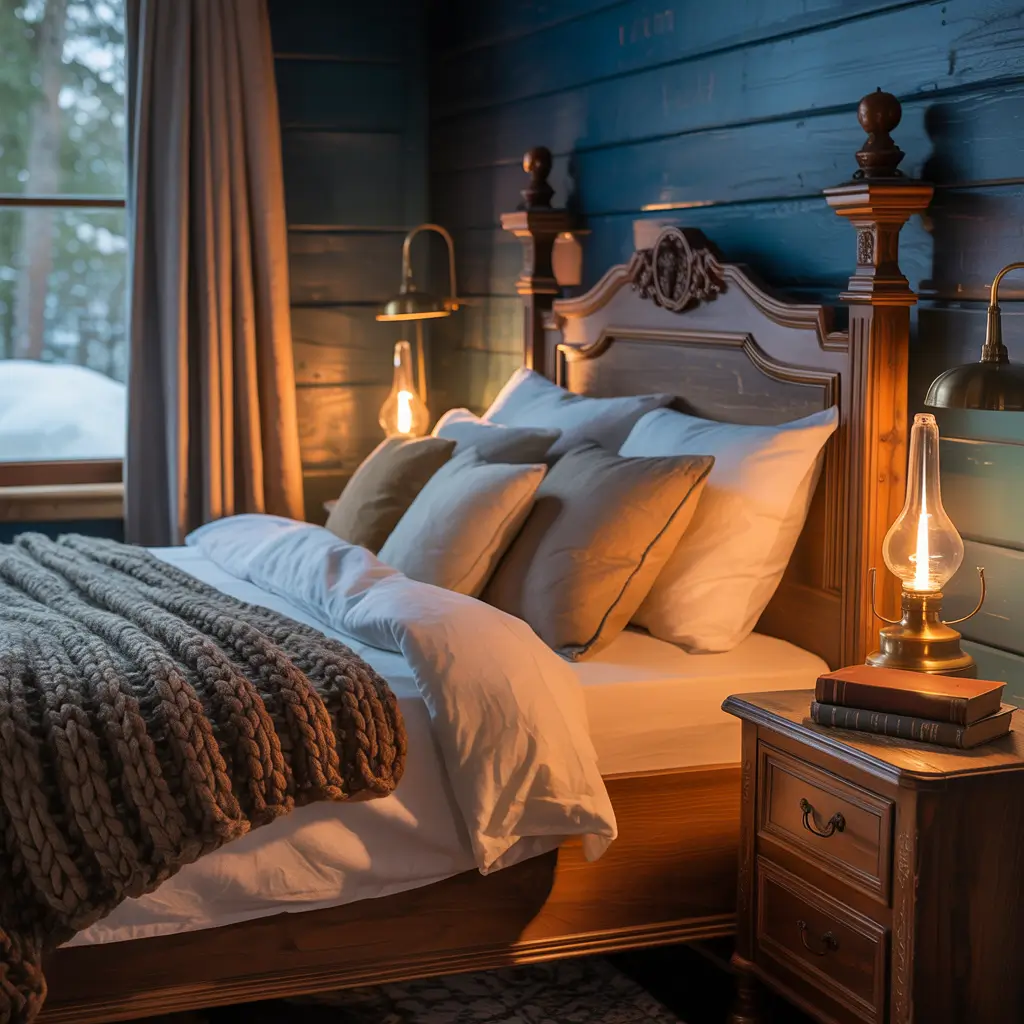 My cabin bedroom uses this pairing, and guests always comment on how cozy it feels. Navy walls with exposed ceiling beams, a reclaimed wood headboard, vintage wooden nightstands, and a live-edge bench at the foot of the bed. The room feels like a warm hug.