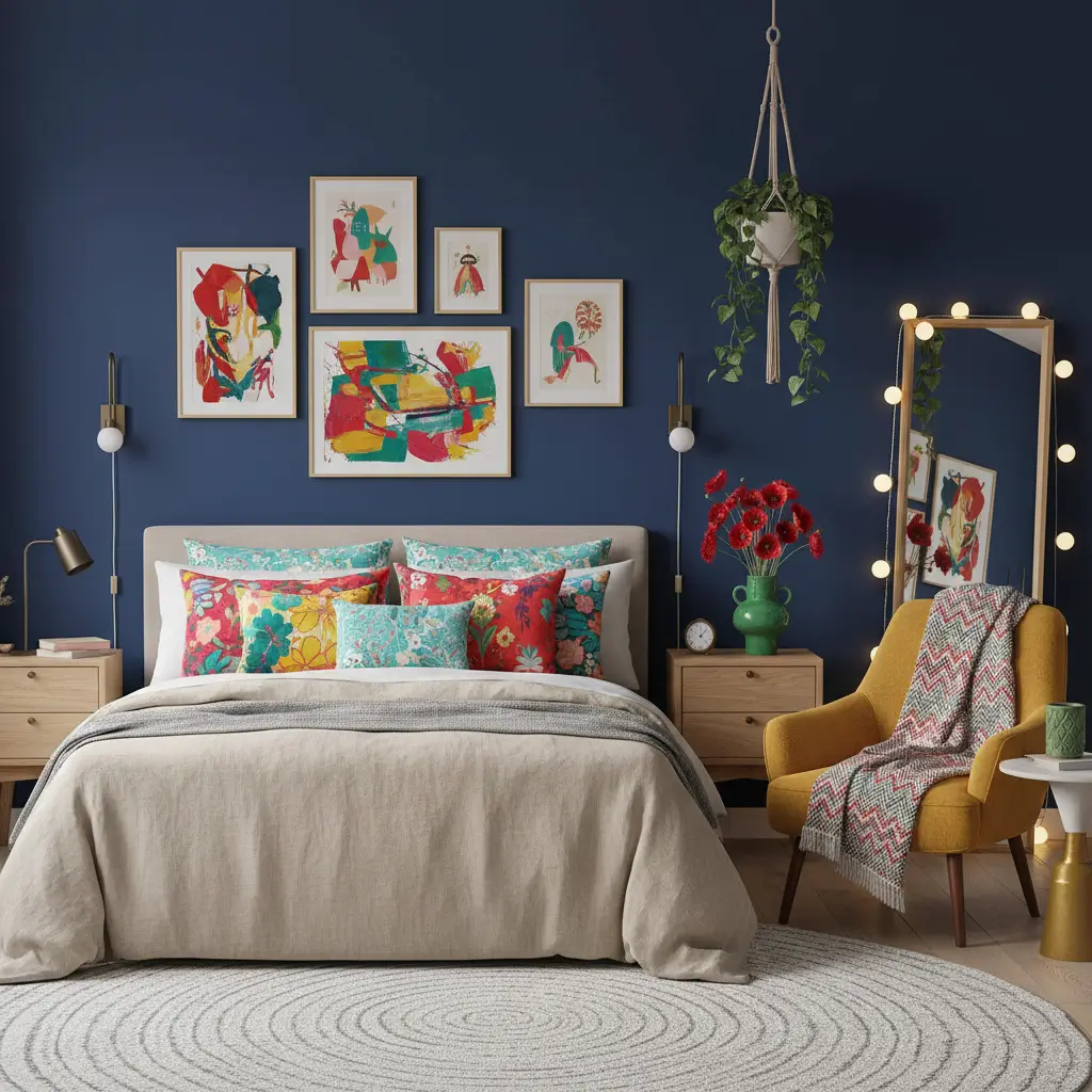 Dark Blue Bedroom with Pops of Bright Colors