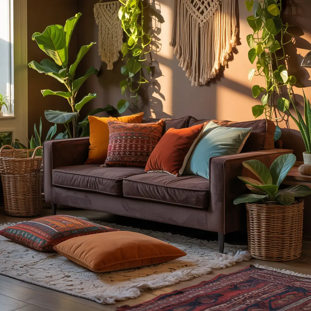 Essential boho elements to pair with dark brown couches:
