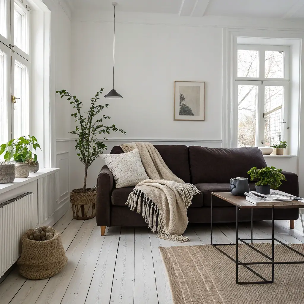 Scandinavian elements that balance dark brown couches: