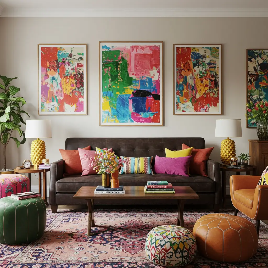 What makes this approach so successful is how the solid foundation of your dark couch anchors all those vibrant colors. Without that substantial neutral base, multiple bright colors could easily feel chaotic or childish. Your brown sofa provides the visual weight that makes the color play feel intentional and sophisticated.