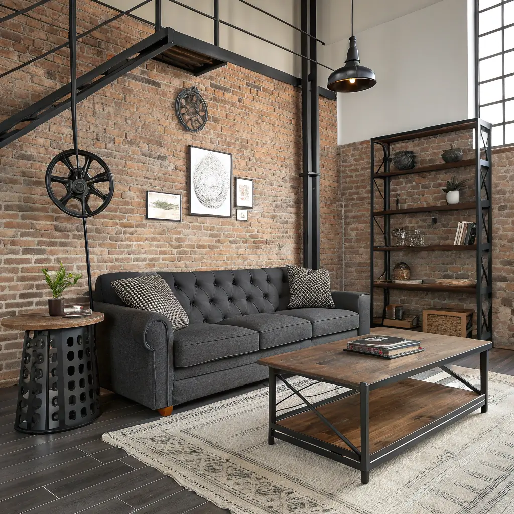 - Lighting: Black metal floor lamps with Edison bulbs add that vintage factory feel.