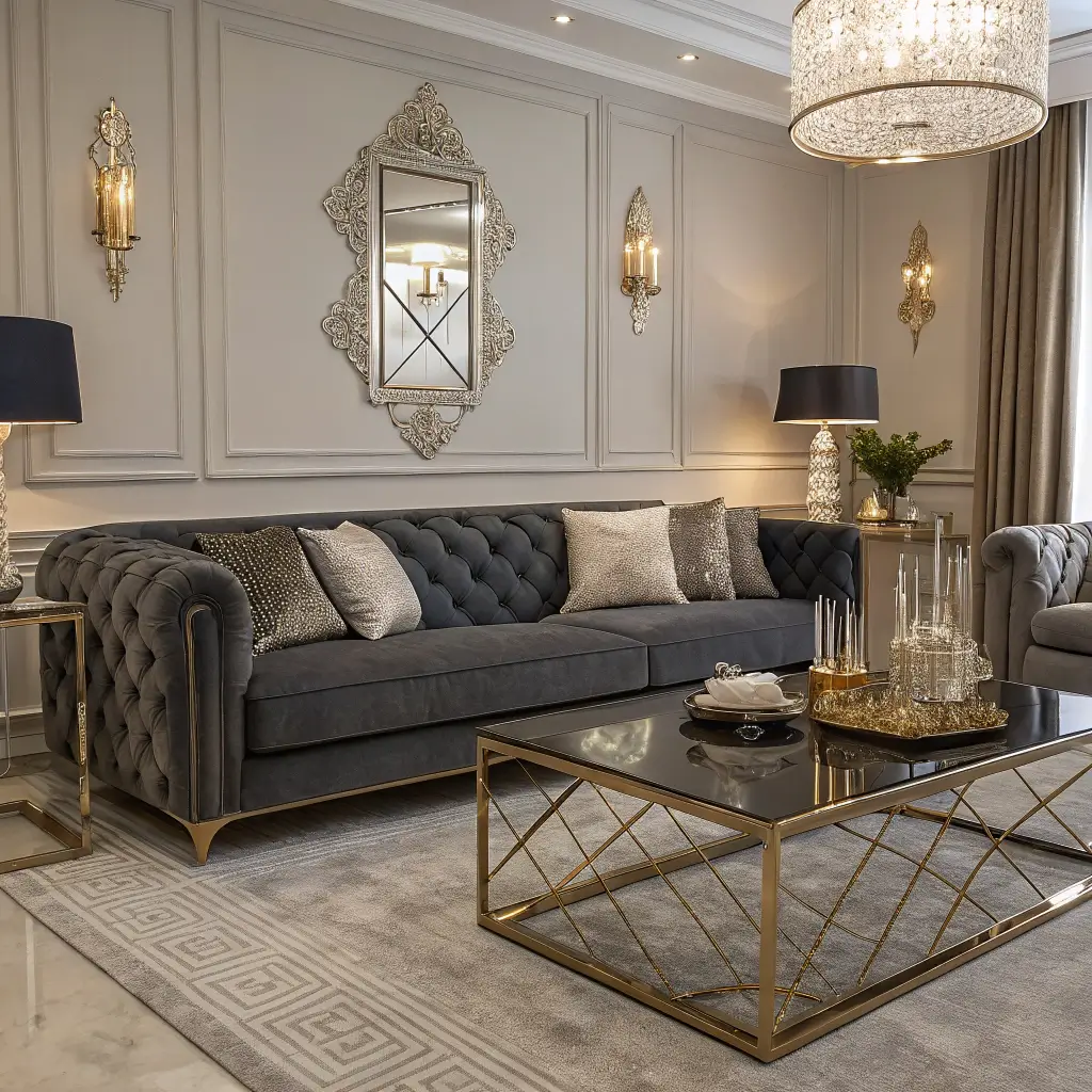- Lighting: A crystal chandelier or a polished brass floor lamp will make the sofa cushions “glow.”